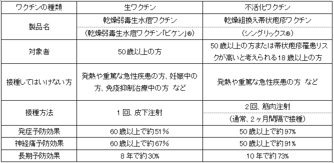 帯状疱疹の予防には、帯状疱疹ワクチンが有効です。このワクチンは、帯状疱疹ウイルスに対する免疫力を高め、帯状疱疹やその後の神経痛を予防することが期待されています。表1に示すようにワクチンには2種類ありますが、SLEの患者さんには、主に乾燥組換え帯状疱疹ワクチン(シングリックス®)が対象となります。また、健常な方では50歳以上が対象ですが、多くの成人SLE患者さんは年齢によらず、接種が推奨されます。主治医の先生と接種の必要性について相談の上検討してください。
